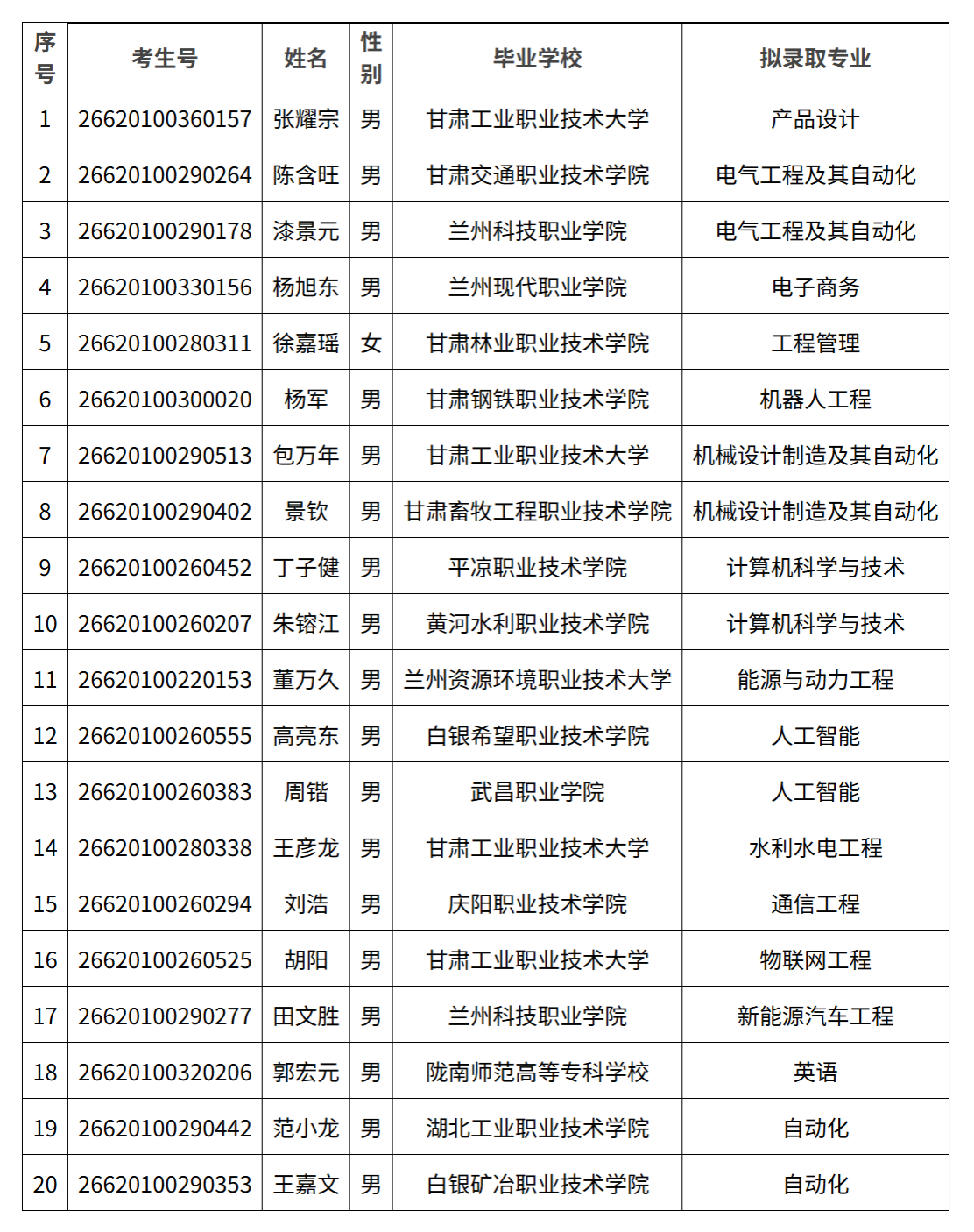 附件:兰州信息科技学院2026年高职(专科)升本科免试招生拟录取名单(第一轮)